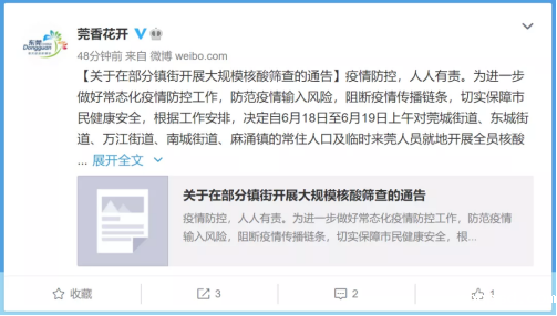 6月18日19时许,广东省东莞市人民政府新闻办公室官方微博@莞香花开 发布“关于在部分镇街开展大规模核酸筛查的通告”。