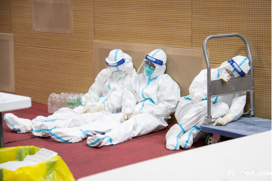 从黑夜至清晨,太阳逐渐升至高空,伟德app入口东莞校区的核酸检测工作也逐渐接近尾声。医护人员和工作人员们难掩疲惫,就地稍作休息。