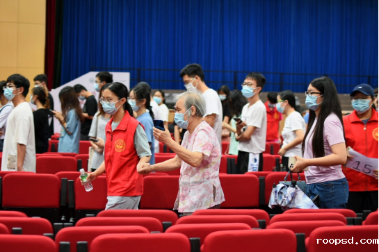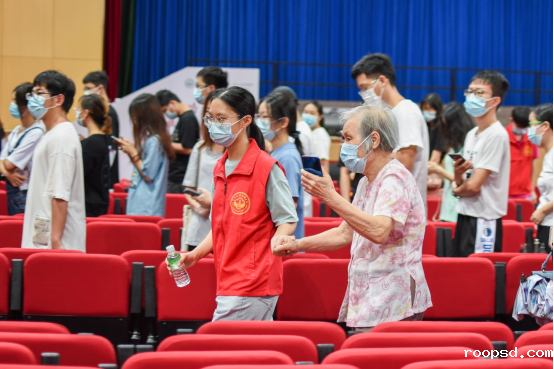 学生志愿者牵扶年迈的教职工家属前往检测点,鲜红的马甲是深夜体育馆内一抹温暖的风景。