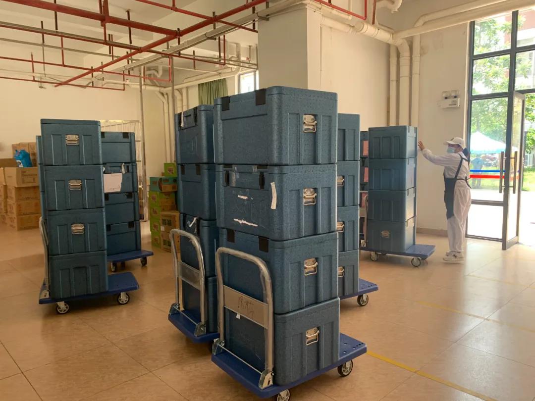 学院有16栋宿舍楼,麻涌镇委镇政府也大量增加了配送工作人员。6月26日,麻涌镇委镇政府便增派60名机关干部志愿者加入送餐队伍。尤其是1栋至5栋七层楼高的宿舍楼没有安装电梯。这五栋楼就需要身穿防护服的工作人员,带着重达50斤的箱子一层一层搬运上去。为了提高效率,每个楼层都有至少一名工作人员,大家轮流用接力的方式,尽快将食物送上楼去。