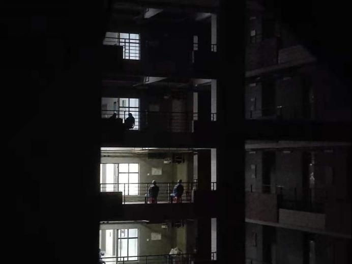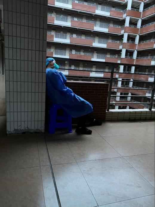 25日凌晨1点,穿好蓝色的防护服,带上手套、面罩,我和我的小伙伴坚定地迈进了宿舍大门。楼下值守的楼长是和我一批进驻的经贸学院的老师,此时的她也坚守在自己的岗位上,热情地提醒我们带上凳子和饮用水。