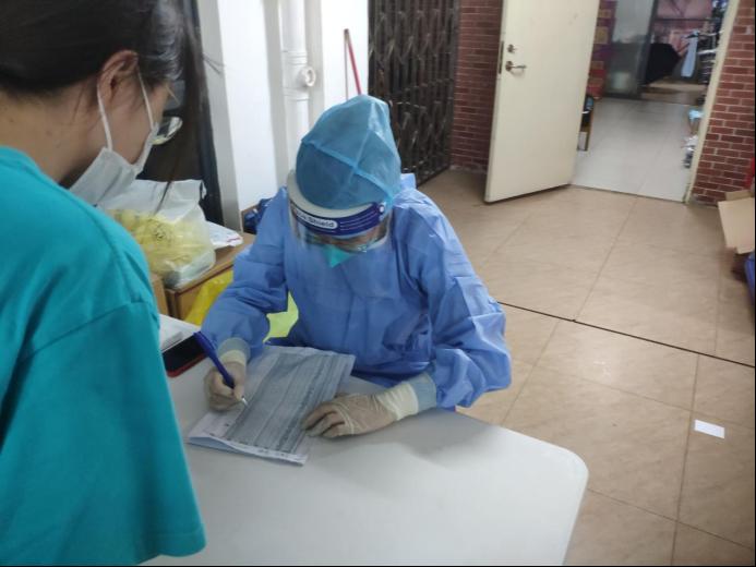 中文系党总支吴桂玲同志坚守志愿服务岗位,图为吴桂玲同志为学生核酸采样进行信息核对登记。