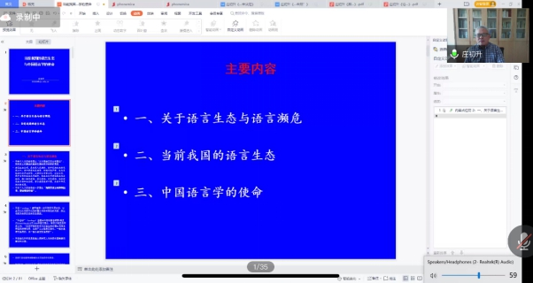 中文系语言学学科带头人庄初升教授为同学们带来了《当前我国语言生态与中国语言学的使命》精彩讲座,旨在为拓宽中午系学生的学术视野,充实大家隔离期间的学习生活,唤醒保护我国语言的使命。当前校内的疫情形势较为严峻,因此,本次讲座采取在线讲授的方式进行。该讲座由系张翠玲老师主持,中文系语言学教研室全体教师,2020级全体学生,以及2018级、2019级的部分同学参加了本次讲座。