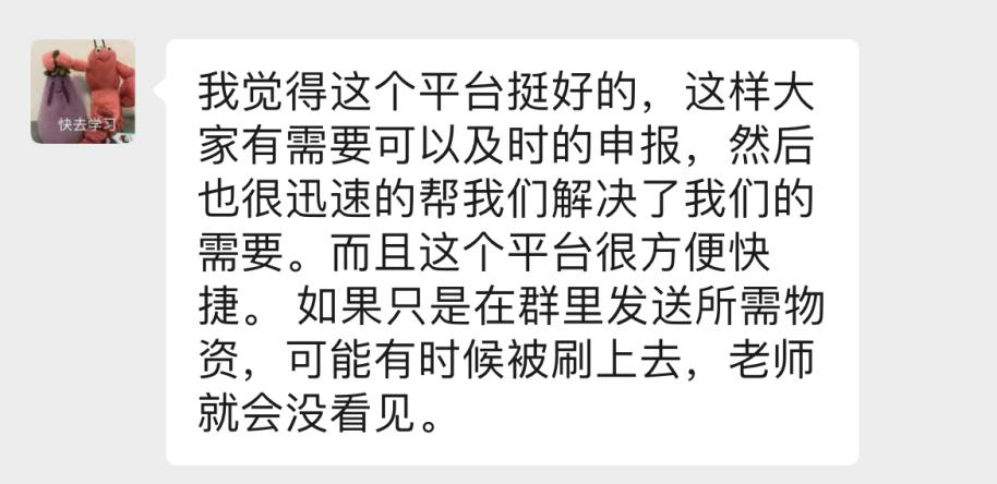 抗疫工作奉献了自己的力量。目前,该平台在全校范围内使用已基本平稳,多数反馈“比以前信息接龙的方式方便多了”“配送的效率大大提高,不仅是日常物资,药品也能及时送达”。该平台最大的意义其实是信息化、实用性和实时性。这是在当前高校抗疫工作中的一个重大突破,希望能为之后的高校抗疫预案提供充分的借鉴。