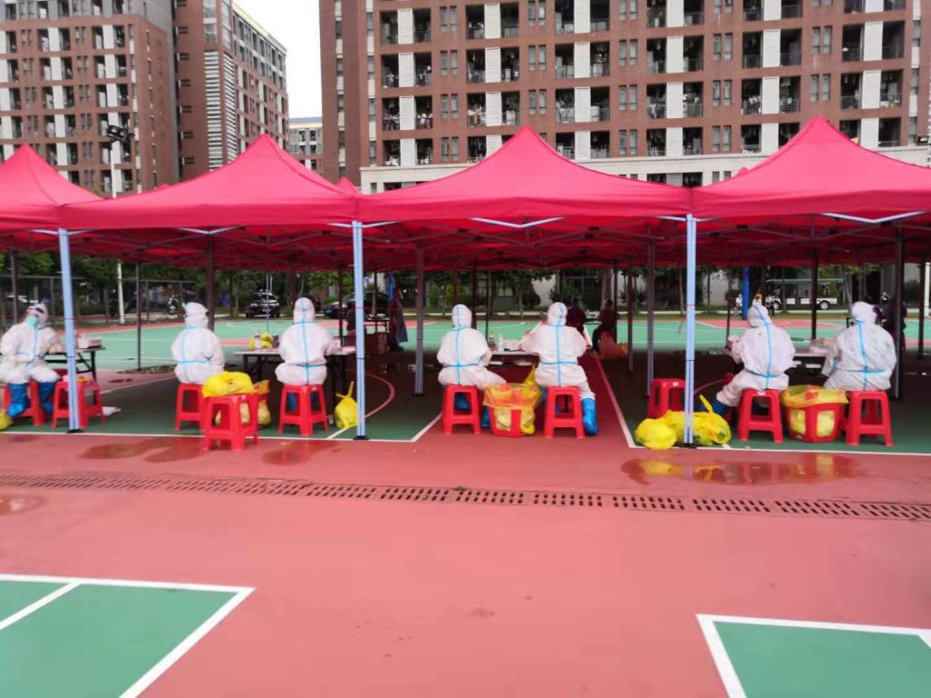 细雨中,医护人员在搭好的雨棚底下等待学生的到来