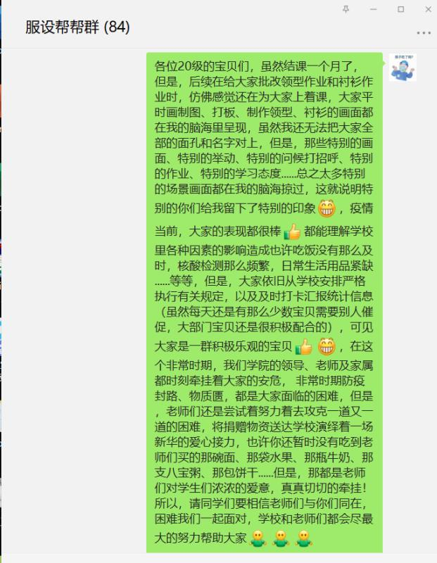 党员郑培心老师为服装专业学生加油打气