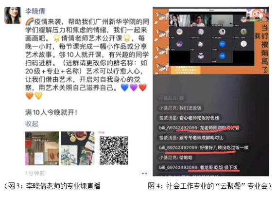 官心老师主动邀约社会工作专业的老师们,一起策划、开展了形式多样的教学活动,或轻松、或活泼,或专业、或严肃。公关专业学专业的老师在学生关爱群的开场互动,以及人力资源管理、传播学、行政管理专业的老师在学生群、朋友圈的分享等等,无不从教学角度,去消除学生的紧张,引导学生的自主探究。