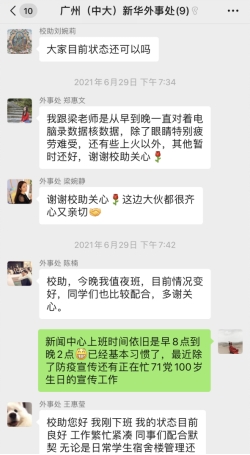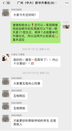 外事处领导们由于被属地疾控部门执行集中隔离未能亲自参与东莞校区一线抗疫,但他们时刻关心着在一线的同事。刘霖霖校长助理和康星华副处长多次慰问在抗疫一线的工作人员,要求全员服从学校疫情防控专班安排,全力以赴;同时叮嘱全体同事要同心抗疫,做好防护,相互照应,互相帮助。外事处全员互相扶持,自觉完成每日核酸检测,做到应检尽检。