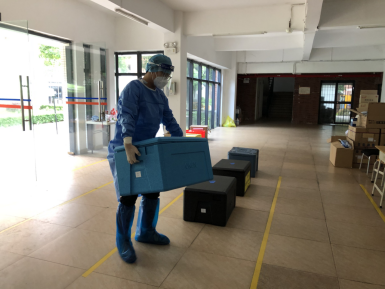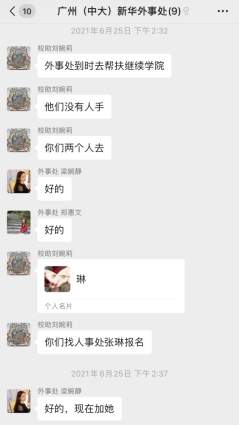 6月23日下午,外事处陈楠、王惠莹在收到学校紧急调配教职工支援东莞校区抗疫工作的通知后第一时间主动请战。6月23日晚,外事处谭静、蔡露响应学校号召支援东莞校区抗疫,他们组成了外事处首批东莞支援小队,与学校其他单位首批支援东莞校区的教职工一起在广州校区南门集合出发前往东莞校区。24日凌晨2点半,他们顺利抵达东莞校区,当日上午8点,在接受了简短的防护培训和快速的岗位分配后便立即开始投入工作。