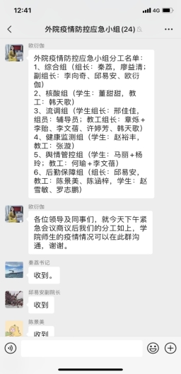 外国语学院于20日下午召开了教职工紧急会议,传达学校疫情防控领导小组关于疫情防控的工作部署。同时,针对学院防疫要求作出紧急部署,成立了外院疫情防控应急小组,明确各小组成员分配及各自分工,第一时间组织摸清院内在校教职工及家属63人,在校外籍教师3人,以及全部在校学生的健康状况。同时,学院安排了两位老师分别对隔离教职工和隔离学生进行24小时健康状况监控,确保师生信息采集全覆盖,确保信息报送及时准确。