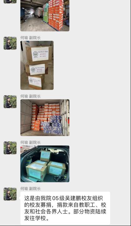 得知疫情的发生后,外国语学院毕业生们心系母校,积极捐献防疫及生活物资给处在隔离中的老师同学。外国语学院副院长何瑜积极联系校友会负责人,募集物资并送到在校的师生手里。校友们用行动诠释了爱的力量。
