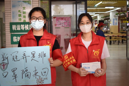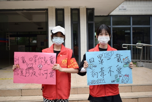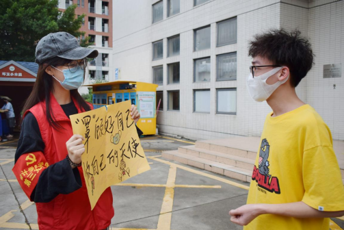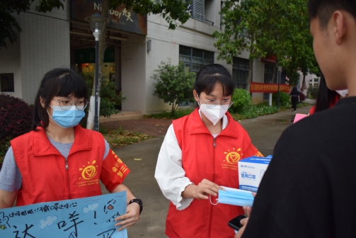 活动开始前,支部志愿者们按照人员分配如期抵达各栋宿舍楼大门、食堂大门,并做好集合签到、更换红色志愿服、佩戴袖章和团徽、消毒清洁等准备工作。活动过程中,志愿者们手持防疫宣传语卡片、备用新口罩和消毒液等物品在对应地点进行宣传。期间,他们耐心地提醒过路师生佩戴好口罩、做好防疫措施、严格遵守一米间隔距离,并积极地向大家宣传防疫知识;当遇到未正确佩戴口罩或未佩戴口罩的师生,志愿者们也会主动上前提醒,免费提供口罩的同时并告诉他们规范佩戴口罩的方法。