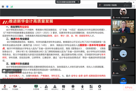 2023年1月3日,刘运国以线上会议形式面向会计学院全体党政干部和师生作“学习贯彻党的二十大精神,推进bv伟德体育app官网会计高质量发展”为主题的党的二十大精神宣讲辅导报告。宣讲会上,刘运国围绕党的二十大报告中“加快构建新发展格局,着力推动高质量发展”部分内容,对我国当前的经济发展形势进行分析,并对会计学院的各项工作进行了部署,明确了学院未来的发展方向。他强调,要将党的二十大精神贯彻落实到工作实际当中,致力实现会计学院高质量发展。